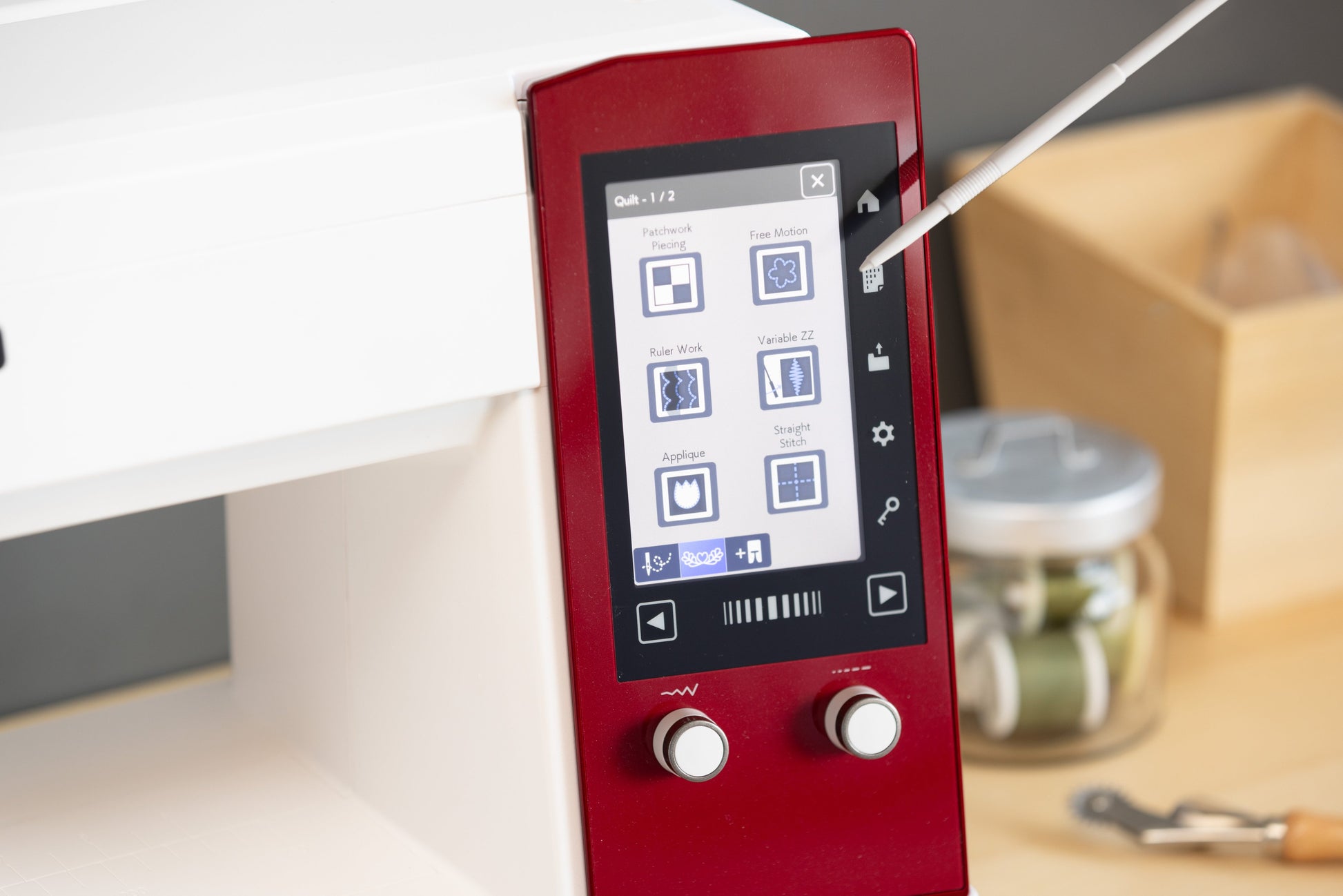 Le pied et la plaque aiguille HP permettent des coutures droites et des marges de ¼" impeccables, et le système exclusif A.S.R. (Accurate Stitch Regulator) offre une régularité de point spectaculaire en piqué libre, y compris pour le travail avec règles.